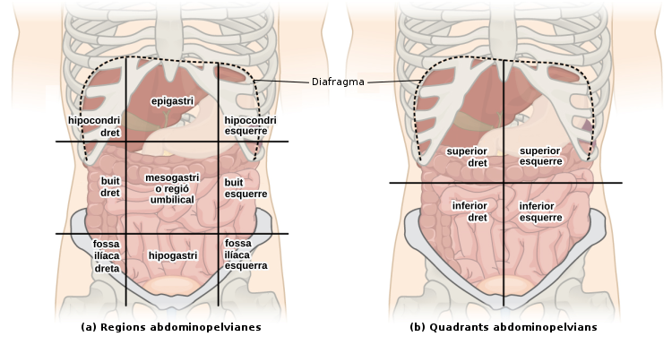 - Regió abdominopèlvica: és la part inferior del tronc. S’estén des del diafragma fins al terra de la pelvis.