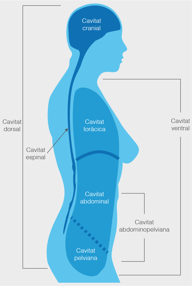 Al cos humà hi ha diverses cavitats o espais que ubiquen els òrgans interns (vegeu la figura):