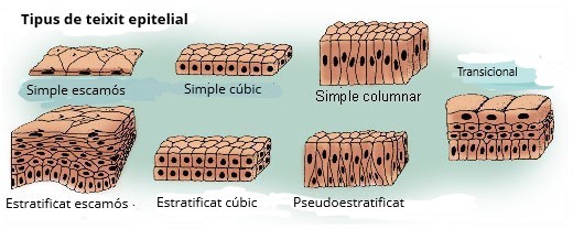 Hi ha diversos tipus de teixit epitelial (vegeu la figura), ja que es poden classificar segons la funció, la forma de les cèl·lules i el nombre de capes: