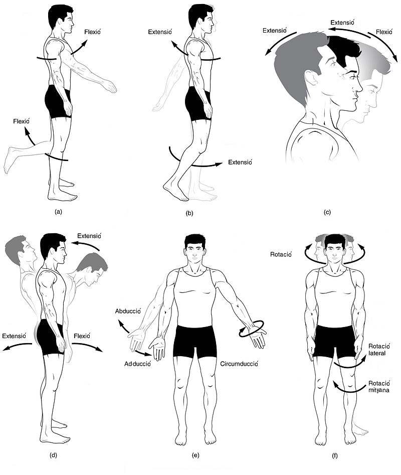 A continuació veurem una sèrie de termes generals que es poden utilitzar per descriure la majoria dels moviments que el cos produeix (vegeu la figura). La majoria dels termes tenen un altre d’oposat; per aquesta raó, es tracten de dos en dos: