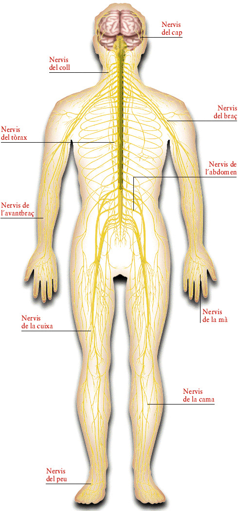 - El sistema nerviós perifèric, que està constituït pels dotze parells de nervis que neixen de l’encèfal, pels trenta-un parells que neixen de la medul·la espinal i totes les ramificacions que s’estenen fins a la perifèria.