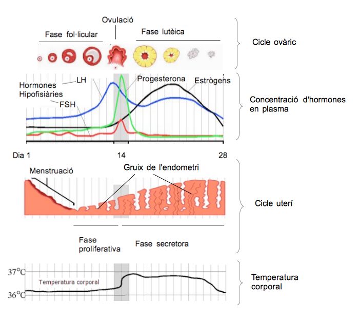 - Fase d’ovulació: el fol·licle descarrega l’ovòcit, que s’allibera i és atret per les prolongacions o fímbries de la trompa de Fal·lopi per ser introduït a l’interior de la trompa i ser transportat cap a l’úter. Els nivells alts d’estrògens fan que les cèl·lules de l’adenohipòfisi es tornin més sensibles i, estimulades per hormones de l’hipotàlem prop del dia 14 del cicle, les cèl·lules de l’adenohipòfisi alliberen les hormones fol·liculoestimulant (FSH) i luteïnitzant (LH). L’LH causa la ruptura del fol·licle madur i per tant l’ovulació. Com que l’ovulació es produeix unes 9 hores després del pic plasmàtic d’LH, si es detecta l’elevació d’LH en plasma per una anàlisi de laboratori, es pot predir l’ovulació amb un dia d’antelació. Després de l’ovulació, la temperatura corporal augmenta de mig grau a un grau centígrad i es manté així fins al final del cicle; això es deu a la progesterona, que és secretada pel cos luti.