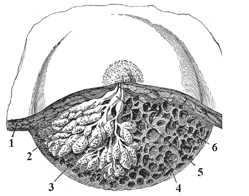 L’element principal del teixit glandular són els alvèols, estructures tubulars buides d’uns quants mil·límetres de longitud, recoberts per cèl·lules epitelials i envoltats per cèl·lules mioepitelials. Aquests alvèols es reuneixen formant grups anomenats lòbuls, i cadascun d’aquests lòbuls posseeix un conducte lactífer que drena en els orificis del mugró. Les dones tenen normalment dues glàndules mamàries, una a cada mama, i cadascuna consta d’entre 10 i 12 lòbuls. La zona que envolta el mugró s’anomena arèola (vegeu la figura).
