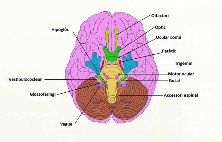 Els nervis cranials neixen de la part inferior de l’encèfal i innerven el cap, coll i part superior del tronc. Estan formats per neurones sensitives, motores o mixtes segons la funció que realitzen. Són dotze parells de nervis (vegeu la figura):