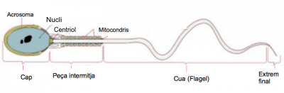 - Fase luteica: va del dia 15 al dia 28 del cicle. Després de l’ovulació, les cèl·lules restants del fol·licle formen una estructura que s’anomena cos luti o cos groc, sota la influència de l’LH. El cos luti sintetitza i secreta estrògens i progesterona, que indueixen la fase secretora del cicle uterí, és a dir, preparen l’endometri per a la implantació de l’òvul fecundat. En cas d’embaràs, el cos luti es transforma en cos luti gestacional i persisteix fins al tercer mes d’embaràs conservant la seva funció secretora d’hormones. Si no hi ha fecundació, el cos luti degenera cap al final del cicle uterí i s’atrofia, quedant una cicatriu, i deixa de secretar estrògens i progesterona, de manera que baixen molt els nivells d’aquestes hormones en sang i, com a conseqüència, les capes superficials de l’endometri de l’úter es desprenen i són expulsades a l’exterior per la vagina durant la menstruació.