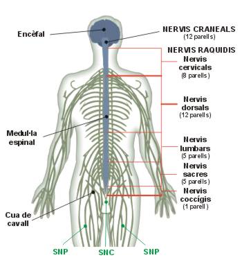 - Nervis espinals: són els que envien informació sensorial (tacte, dolor) del tronc i les extremitats cap al sistema nerviós central a través de la medul·la espinal. També envien informació de la posició i l’estat de la musculatura i les articulacions del tronc i les extremitats a través de la medul·la espinal. Reben ordres motores des de la medul·la espinal per al control de la musculatura esquelètica.