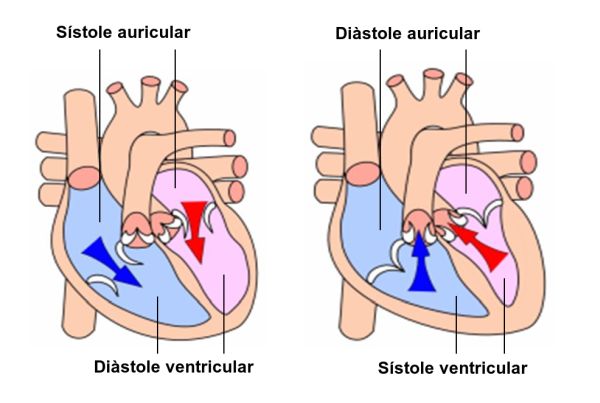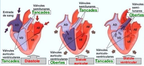La contracció de les aurícules fa passar la sang dels ventricles a través de les vàlvules auriculoventriculars. Quan augmenta la pressió intraventricular, hi ha la coaptació de les vàlvules auriculoventriculars i impedeix que la sang torni a les aurícules. Després de la contracció, el teixit muscular cardíac es relaxa i dona pas a la diàstole auricular i ventricular (vegeu la figura).