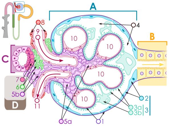 A la figura podeu veure els diferents elements que componen una nefrona: A. corpuscle renal, B. túbul proximal, C. túbul distal i D. aparell juxtaglomerular; com també: