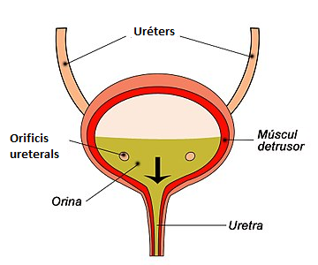 - Finalment, és de nou a través de la medul·la espinal que els nuclis encefàlics estimulen els centres simpàtics que produeixen la contracció del trígon i de l’esfínter extern, impedint la micció.
