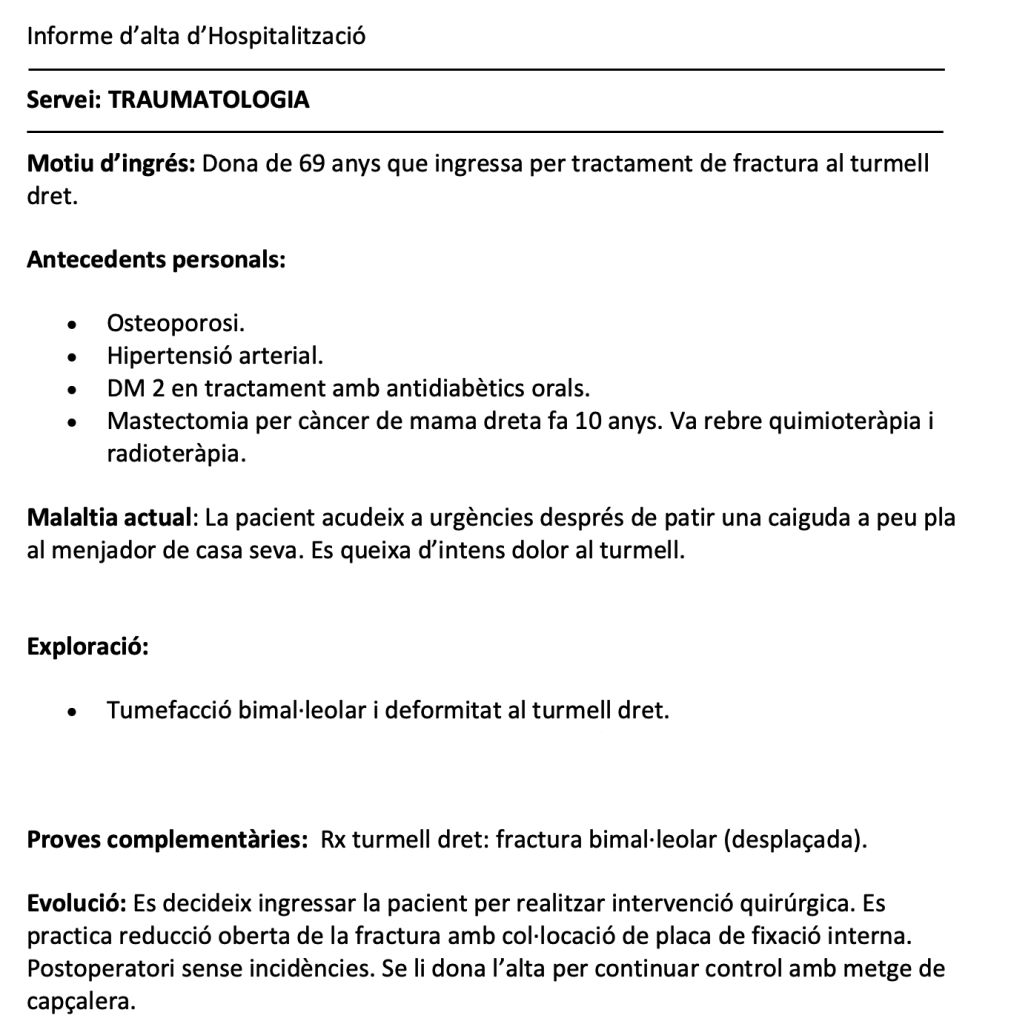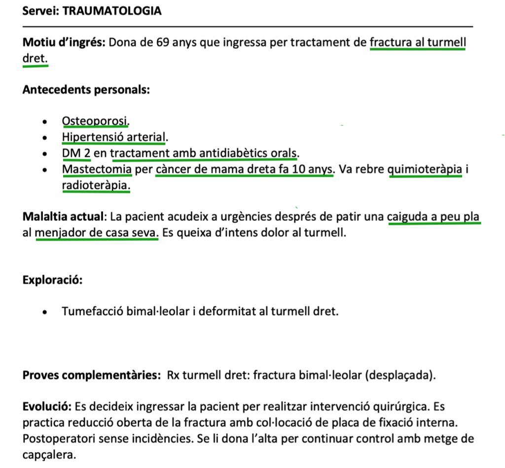 - Pacient que ingressa amb una fractura (desplaçada i tancada) de la falange proximal del dit petit de la mà dreta. La fractura s’ha produït en caure el pacient d’unes escales mecàniques en un centre comercial. Durant l’ingrés pateix un infart agut de miocardi sense elevació del segment ST.