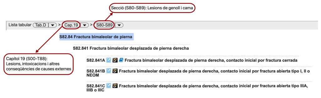 - Fixeu-vos que ens trobem dins la secció Fractures de genoll i cama (S80-S89). A més, el codi S82.84 està inclòs dins de la categoria S82, que té com a literal Fractura de cama, incloent-hi el turmell. Totes aquestes comprovacions ens indiquen que anem en la bona direcció. Només ens queda afegir els caràcters necessaris per obtenir el codi final que reuneixi totes les especificacions que necessitem (costat dret, fractura desplaçada i tancada). (figura):