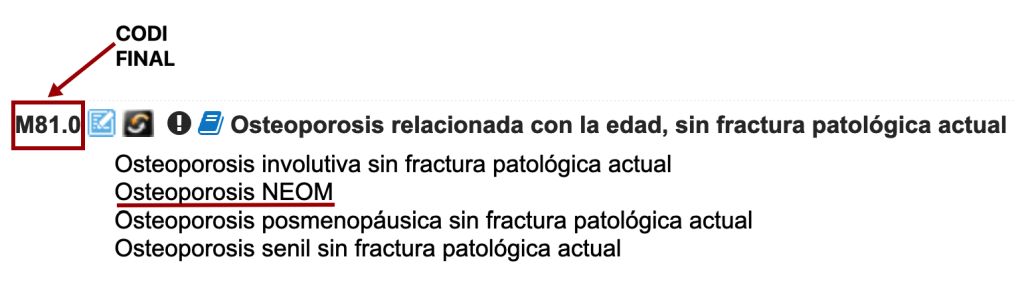 - En aquest cas, quan entrem a la llista tabular amb el codi M81.0 proporcionat per l’índex alfabètic, podem veure que es tracta d’un codi final. El literal, Osteoporosi relacionada amb l’edat, sense fractura patològica actual, ens pot semblar fins i tot massa específic, tenint en compte que la nostra expressió diagnòstica diu únicament osteoporosi. Però fixeu-vos en els termes d’inclusió que hi ha a sota del codi; entre ells hi apareix Osteoporosi NE (=NEOM). Per tant, per codificar una osteoporosi sense cap més especificació, aquest és el codi final correcte (figura).