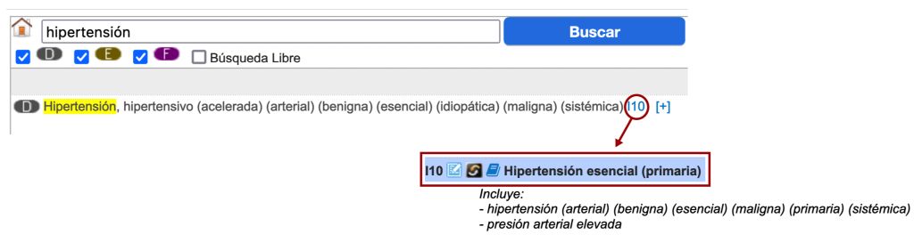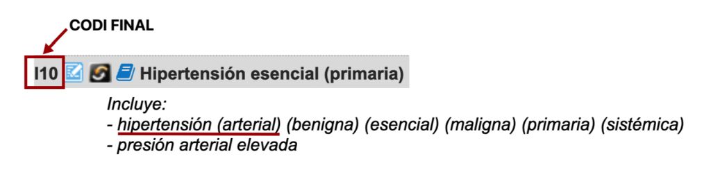 - Aquest cas és semblant a l’anterior; a la llista tabular podem veure que el codi I10 proporcionat per l’índex és ja un codi final, i veiem que el literal, Hipertensió essencial (primària), conté la paraula essencial, que no està present a la nostra expressió diagnòstica. Si revisem els termes d’inclusió, però, veurem que entre ells hi ha el terme hipertensió, acompanyat de diversos modificadors no essencials, entre els quals hi ha el terme arterial, que forma part de l’expressió diagnòstica que volem codificar. Recordem que els modificadors no essencials, tant si estan presents com si no a l’expressió diagnòstica, no modifiquen el codi (figura).