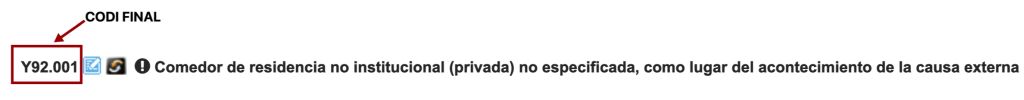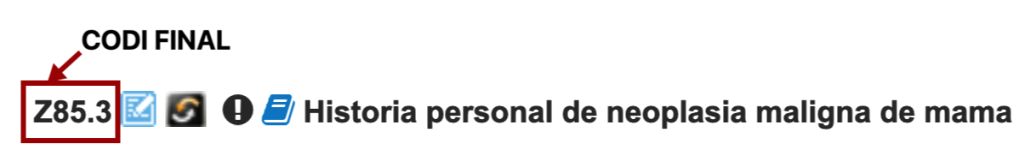 - Un cop tinguem el codi proporcionat per l’índex alfabètic entrar a la llista tabular per comprovar si és o no un codi final, per completar-lo en cas necessari i per revisar l’existència d’instruccions (notes, Exclou 1, Exclou 2…) que puguin fer modificar l’elecció del codi final.