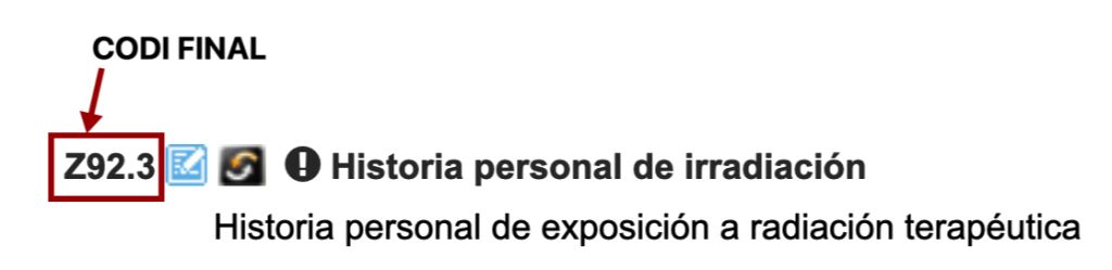 - Estem, novament, davant d’un codi final. L’expressió inclosa a sota del codi, història personal d’exposició a radiació terapèutica, és equivalent a història personal de radioteràpia (figura).
