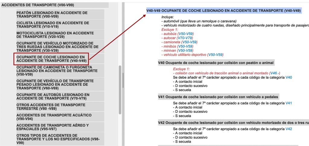 Dins de la secció Ocupant de cotxe lesionat en accident de transport desplaçarem el cursor cap a baix, llegint atentament el literal de cadascuna de les categories que conté, fins que trobem la categoria que necessitem. Recordem que l’accident de trànsit de l’exemple és per col·lisió d’un cotxe amb una furgoneta i la víctima és el conductor del cotxe. Escollirem doncs la categoria V43, Ocupant de cotxe lesionat per col·lisió amb cotxe, camioneta o furgoneta. Dins d’aquesta, haurem d’escollir la subcategoria adequada (V43.1, V43.2, V43.3…). Escollirem la subcategoria V43.5, i a partir d’aquí arribarem fins al codi final (figura):