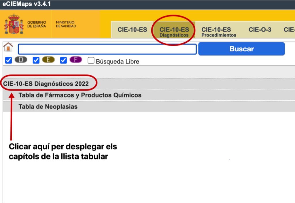 El primer que cal fer quan busquem un codi directament a la llista tabular és desplegar la llista de capítols i escollir el capítol i la secció on creiem que estarà inclòs el diagnòstic que busquem.