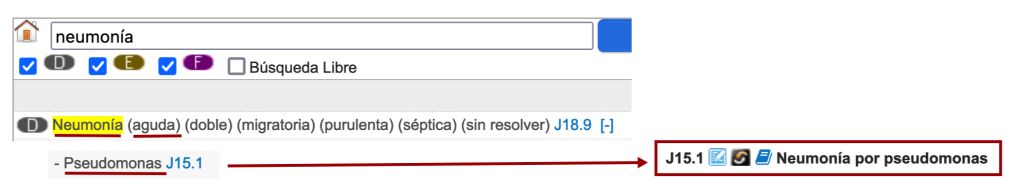 El diagnòstic principal en aquest cas és la pneumònia, perquè són les manifestacions d’aquesta i de les seves complicacions (l’embassament pleural), les que han portat el pacient a l’hospital. Sabem a més quin és el microorganisme causant de la pneumònia, el bacteri Pseudomonas aeruginosa. Quan fem la cerca del terme pneumònia a l’índex veurem si arribem a un codi que inclogui també el microorganisme o no.