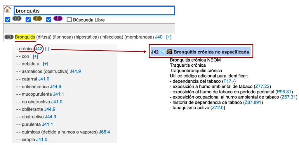 - En aquest cas, un cop arribem a la subentrada crònica, davant l’absència de més especificacions ens hem de quedar amb el codi per defecte, J42. A la llista tabular, veiem que es tracta d’un codi final i que conté una instrucció Empreu un codi addicional, que ens recorda l’obligació de codificar l’existència d’una dependència al tabac (actual o passada) si aquesta està documentada a l’informe.