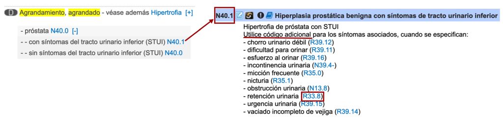 Fixeu-vos que a l’índex alfabètic hem d’escollir l’opció amb símptomes del tracte urinari inferior, ja que en el nostre exemple la hipertròfia de la pròstata ha causat manifestacions, en aquest cas una retenció urinària. Fixeu-vos també que l’índex ens porta al codi N40.1, que no conté la paraula hipertròfia al seu literal, però sí que apareix a sota com a terme d’inclusió.