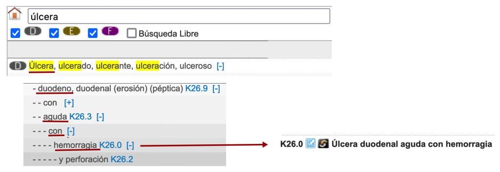 Vegeu com l’índex alfabètic ens condueix cap a un codi de combinació que inclou al mateix temps la malaltia (úlcera) i la manifestació (hemorràgia). En aquest cas, doncs, n’hi haurà prou amb un codi únic.