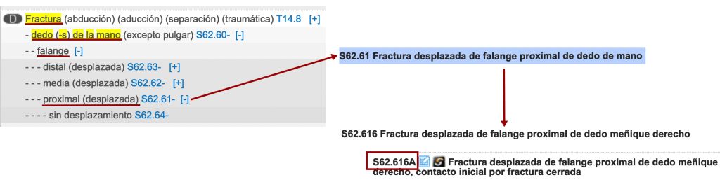 Ens trobem amb una instrucció Vegeu; hi cliquem al damunt i continuem seleccionant. Veurem que l’índex alfabètic ens porta al codi S62.61-. Un cop a la llista tabular, haurem de moure el cursor cap a baix fins a trobar el dit que ens interessa, en aquest cas el dit petit (meñique) de la mà dreta (figura):
