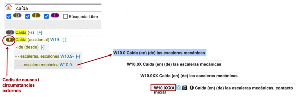 Busquem primer el codi de la caiguda; recordem que cal buscar dins de l’índex de causes externes, que a eCIEMaps ve indicat amb la lletra E davant del terme principal (figura):