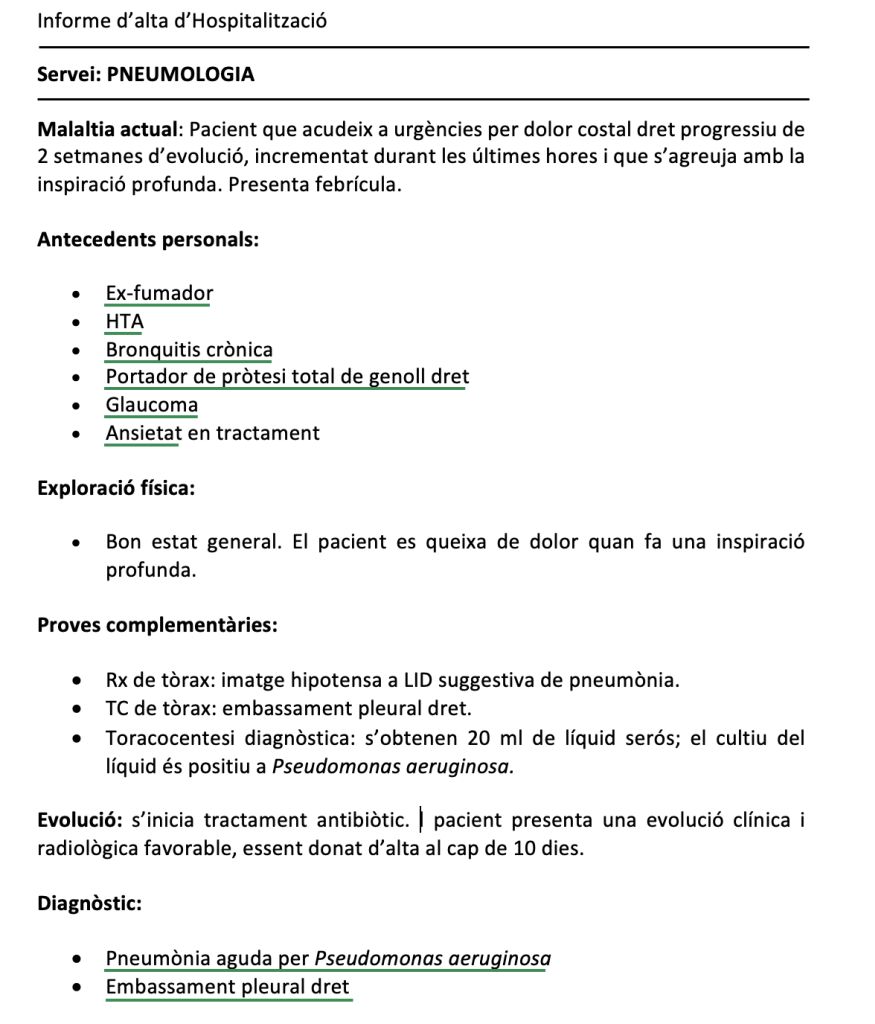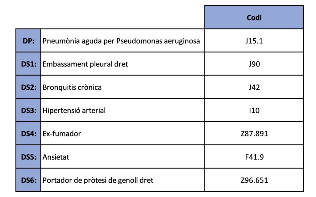 Fixeu-vos que no hem subratllat ni el dolor costal ni la febre, perquè es tracta de manifestacions pròpies de l’embassament pleural i la pneumònia respectivament. Recordem que els símptomes i signes que són part integral d’un procés patològic no cal codificar-los.