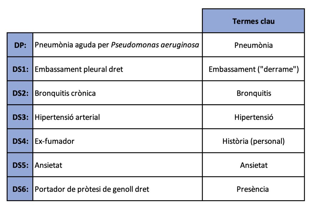 A l’apartat 1.2.1 de la Lliçó 1, trobareu diversos exemples que us ajudaran a entendre quins conceptes hem de considerar com a diagnòstics a l’hora de codificar.