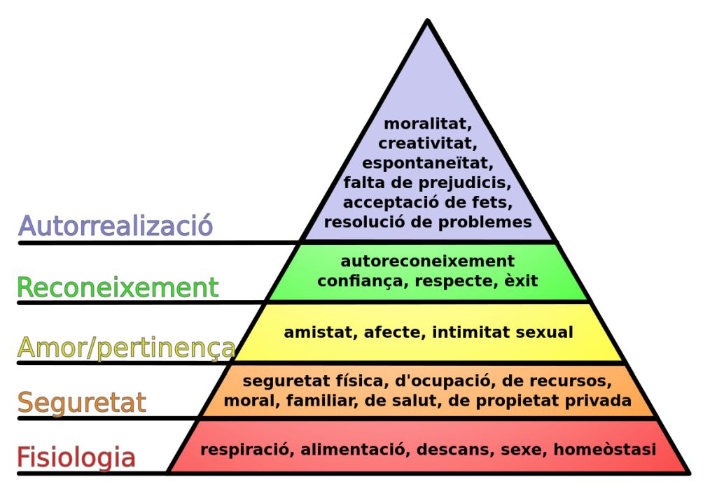 Segons Maslow, el comportament humà està motivat sobretot per l’objectiu de cobrir certes necessitats, que va agrupar en cinc nivells i va ordenar de manera jeràrquica segons la importància que tenen per al nostre benestar: