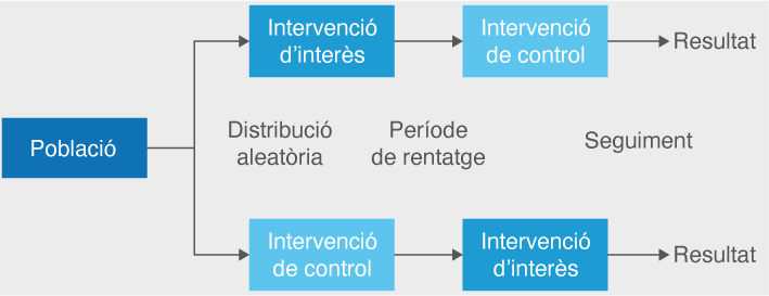 És l’assaig clínic en el qual ambdós tractaments d’estudi (experimental i control) són administrats a cadascun dels pacients en períodes successius que han estat predeterminats, generalment de manera aleatòria, permeten a cada individu ser el seu propi control (vegeu la figura). Aquest tipus d’estudis garanteix que els individus dels diferents grups tinguin les mateixes característiques, ja que són els mateixos.