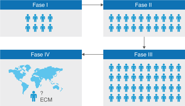 Les fases d’un assaig clínic són quatre (vegeu la figura). La fase III seria la que representa al grup més gran de persones, mentre que a la Fase IV el món està en ECM (‘assajos clínics amb medicaments’), perquè és quan el medicament ja es comercialitza; tanmateix, ha de passar el temps per veure si hi ha efectes adversos a posteriori (d’aquí l’interrogant).