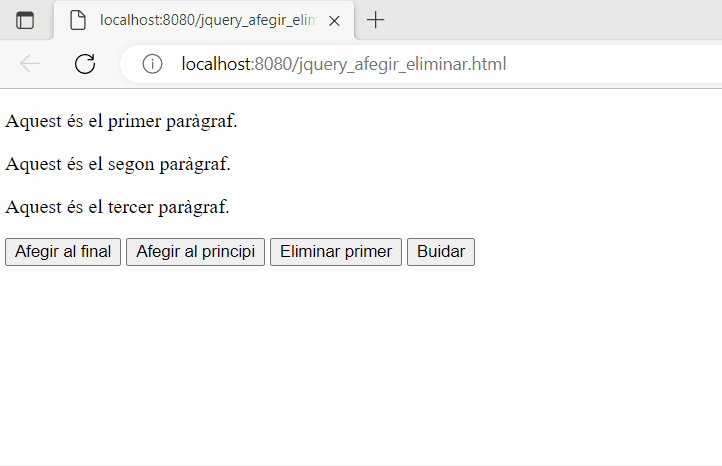 - remove(): serveix per eliminar un element o conjunt d’elements de la pàgina web. Aquest mètode no accepta cap paràmetre i elimina tots els elements seleccionats.
