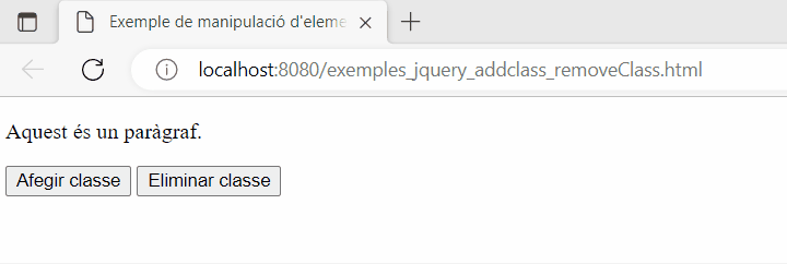 - addClass(): serveix per afegir una o més classes a un element. Aquest mètode accepta com a paràmetre una cadena amb el nom de la classe o classes que es volen afegir, separades per espais.