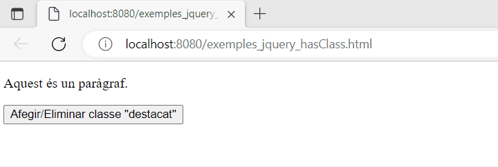 hasClassde jQuery. Aquest mètode retornatruesi l’element té la classe especificada ofalseen cas contrari. Per exemple,paragraf.hasClass(‘destacat’)retorna true si el paràgraf té la classedestacati false en cas contrari.