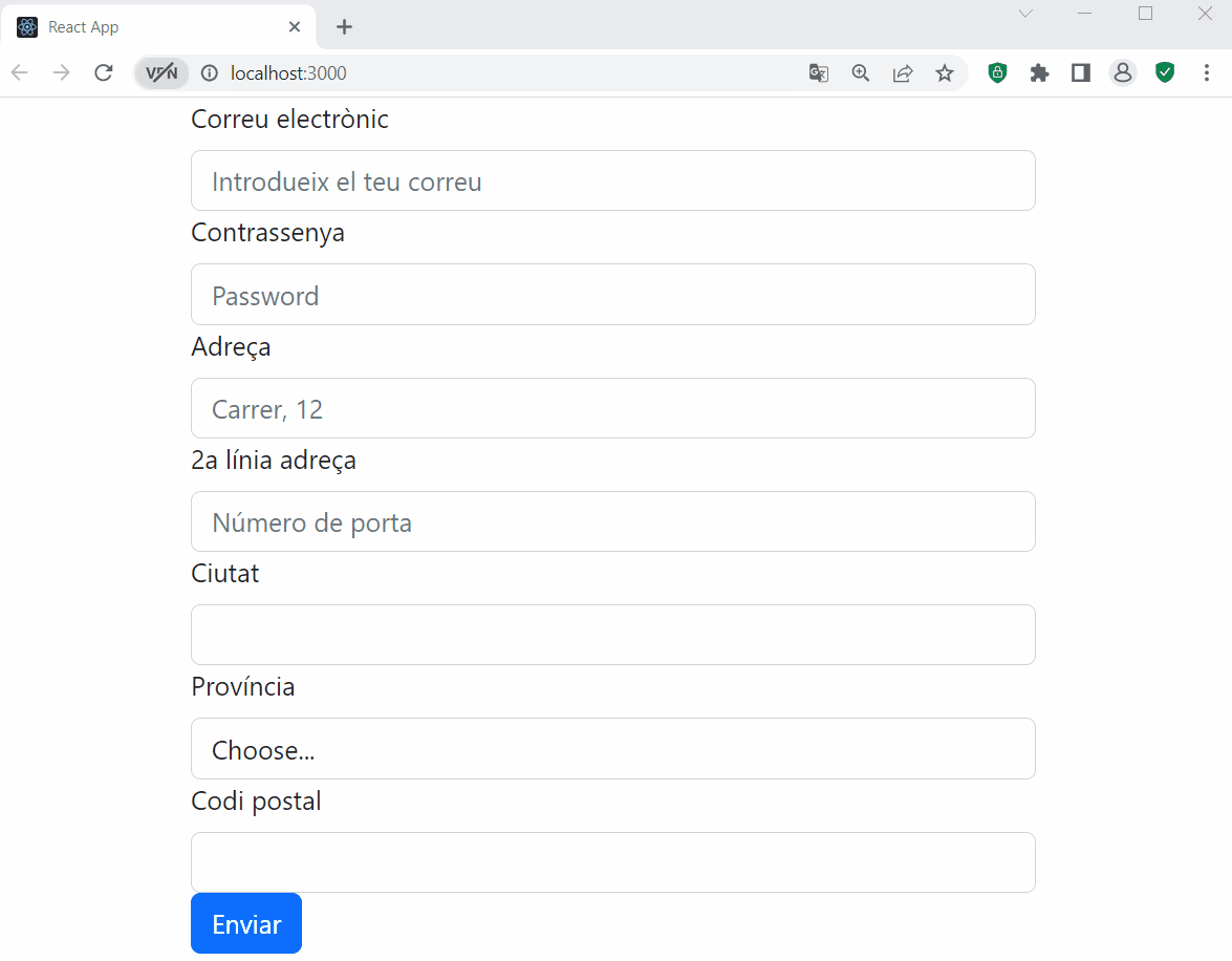 - El tercer i el quart grup del formulari són camps d’entrada d’adreça, on s’utilitza la mateixa estructura que les etiquetes Form.Label i Form.Control per definir la llegenda i el camp d’entrada.