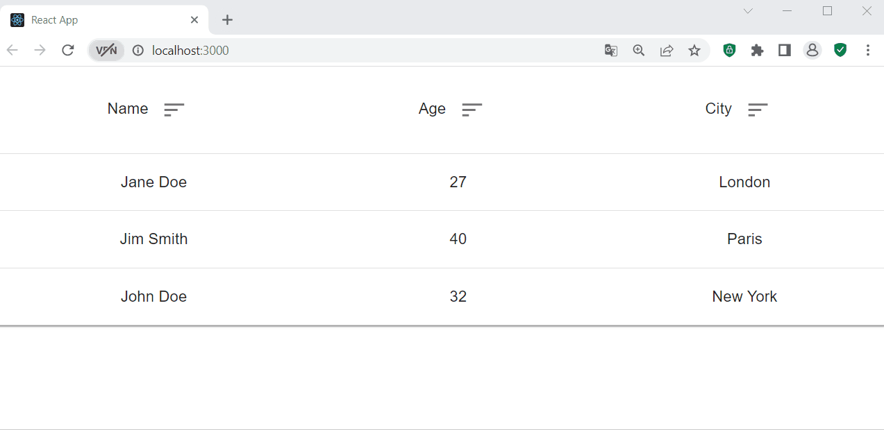 import React from 'react'; import { makeStyles } from '@material-ui/core/styles'; import Table from '@material-ui/core/Table'; import TableBody from '@material-ui/core/TableBody'; import TableCell from '@material-ui/core/TableCell'; import TableContainer from '@material-ui/core/TableContainer'; import TableHead from '@material-ui/core/TableHead'; import TableRow from '@material-ui/core/TableRow'; import Paper from '@material-ui/core/Paper'; import IconButton from '@material-ui/core/IconButton'; import SortIcon from '@material-ui/icons/Sort'; const useStyles = makeStyles({ table: { minWidth: 650, }, }); function TableHeader(props) { return ( <TableCell align="center"> {props.header} <IconButton onClick={props.sortData}> <SortIcon /> </IconButton> </TableCell> ); } function App() { const classes = useStyles(); const [people, setPeople] = React.useState([ { name: 'John Doe', age: 32, city: 'New York' }, { name: 'Jane Doe', age: 27, city: 'London' }, { name: 'Jim Smith', age: 40, city: 'Paris' }, ]); const sortData = (key) => { setPeople([...people].sort((a, b) => { if (a[key] < b[key]) { return -1; } if (a[key] > b[key]) { return 1; } return 0; })); }; return ( <TableContainer component={Paper}> <Table className={classes.table} aria-label="simple table"> <TableHead> <TableRow> <TableHeader header="Name" sortData={() => sortData('name')} /> <TableHeader header="Age" sortData={() => sortData('age')} /> <TableHeader header="City" sortData={() => sortData('city')} /> </TableRow> </TableHead> <TableBody> {people.map((person) => ( <TableRow key={person.name}> <TableCell align="center">{person.name}</TableCell> <TableCell align="center">{person.age}</TableCell> <TableCell align="center">{person.city}</TableCell> </TableRow> ))} </TableBody> </Table> </TableContainer> ); } export default App;