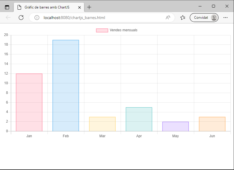 Les opcions de configuració són similars a les del gràfic de línies, amb la diferència que el tipus de gràfic ara és bar en lloc de line. A més, en aquest cas, hi ha una sèrie de dades per a cada mes, anomenades datasets, que inclouen informació sobre el color de fons i el color de la vora per a cada barra, així com la quantitat de dades que s’han de mostrar.