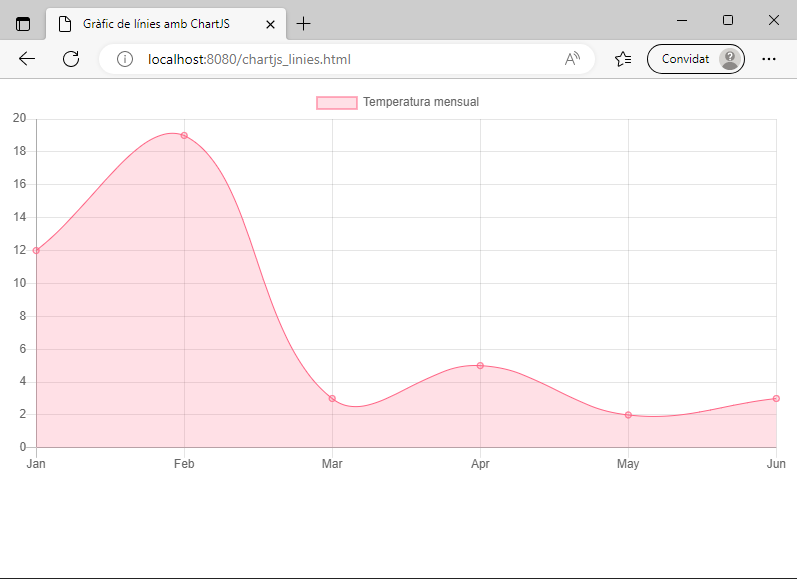 <!-- Incloure la biblioteca de Chart.js. --> <script src="https://cdn.jsdelivr.net/npm/chart.js@2.9.3/dist/Chart.min.js"></script> <!-- Crear un llenç on es mostri el gràfic. --> <canvas id="myChart"></canvas> <script> // Obtenir el context del llenç. var ctx = document.getElementById('myChart').getContext('2d'); // Crear un nou gràfic a partir del context i les opcions de configuració. var myChart = new Chart(ctx, { type: 'line', data: { labels: ['Jan', 'Feb', 'Mar', 'Apr', 'May', 'Jun'], datasets: [{ label: 'Temperatura mensual', data: [12, 19, 3, 5, 2, 3], backgroundColor: 'rgba(255, 99, 132, 0.2)', borderColor: 'rgba(255, 99, 132, 1)', borderWidth: 1 }] }, options: { scales: { yAxes: [{ ticks: { beginAtZero: true } }] } } }); </script>