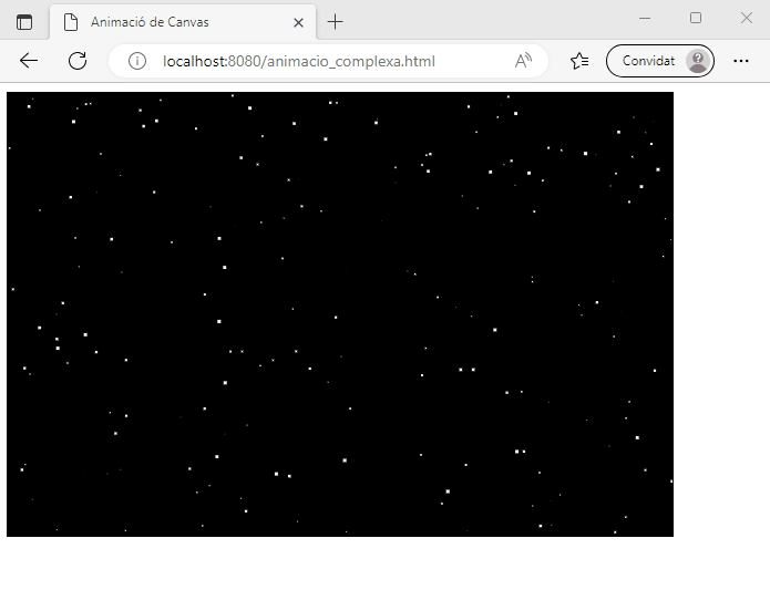 A la funció draw es dibuixen les estrelles amb un rectangle blanc sobre fons negre. Finalment, a la funció loop s’actualitza i es dibuixa el canvas; després cridem requestAnimationFrame per fer una animació fluida: