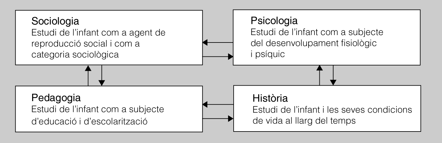 Cada època i cada cultura tenen la seva visió sobre la infància, determinada per les condicions sociohistòriques, però també pels conceptes i sabers sobre els infants que es deriven de les aportacions de ciències com la pedagogia, la psicologia, la història, l’antropologia, la medicina o la sociologia (vegeu lafigura).
