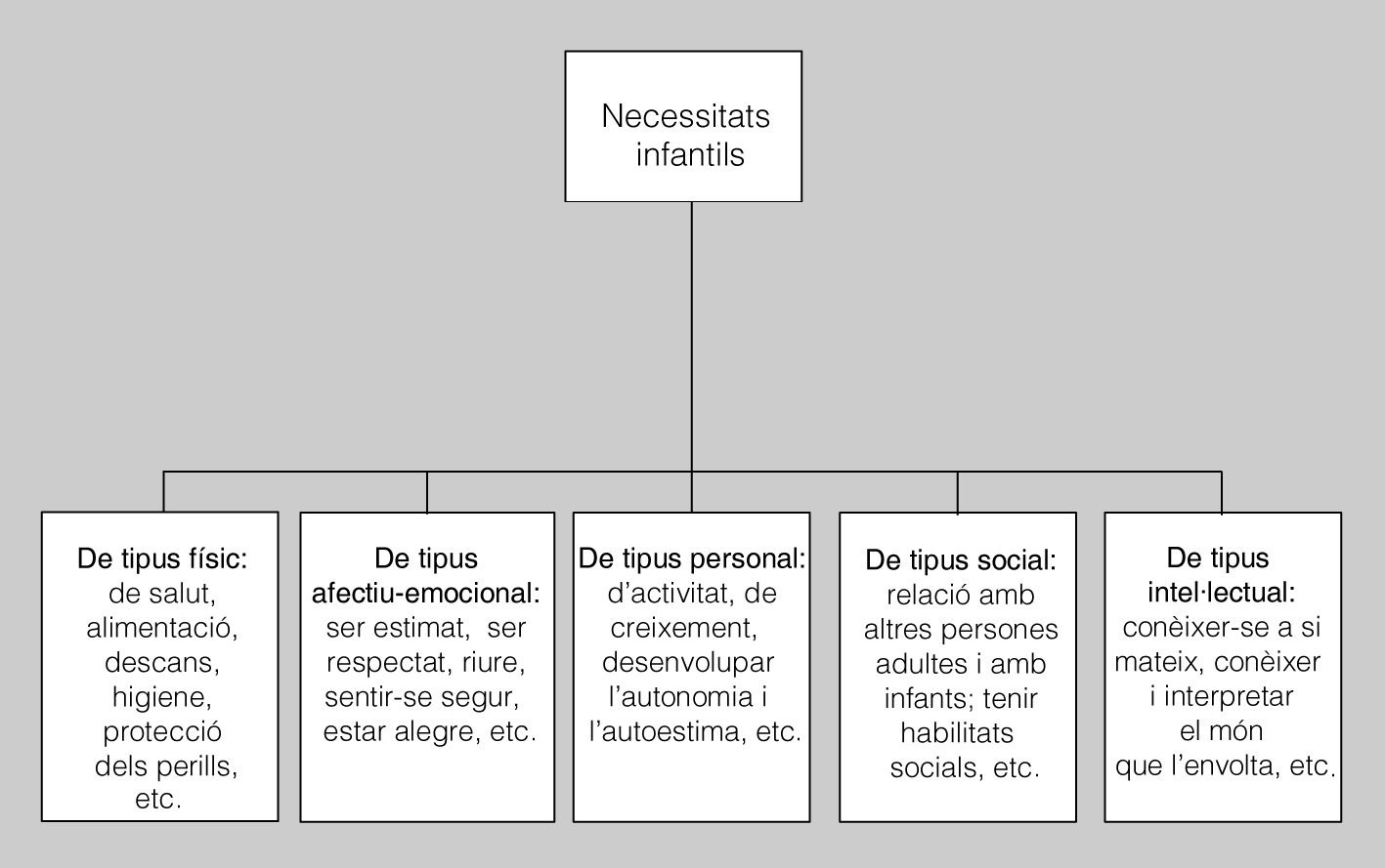 A continuació, podeu veure un resum de les principals necessitats infantils, que ens orienten sobre quins aspectes hem de tenir en compte per afavorir un desenvolupament integral i harmònic.