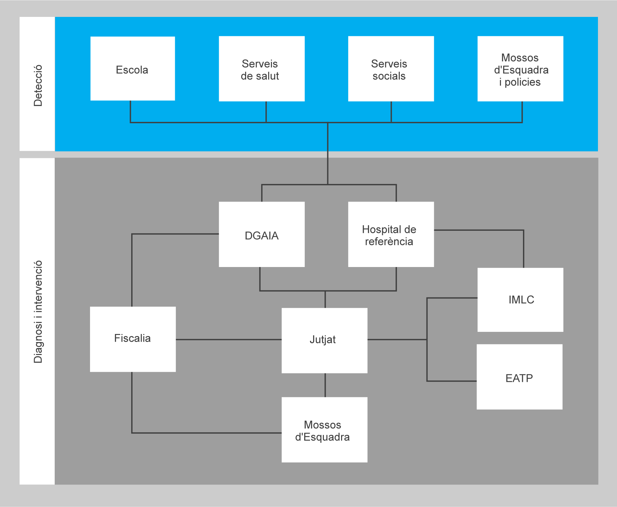 La detecció del maltractament es pot fer des de qualsevol institució com ara l’escola, els serveis de salut, els serveis socials o els cossos de seguretat, els quals ho notificaran a l’organisme competent i s’iniciarà el procés de valoració i diagnòstic en el qual participaran tots els serveis públics necessaris per facilitar una bona intervenció.