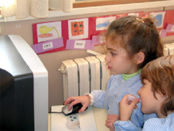 | El racó de l’ordinador ens permet accedir, entre moltes altres coses, a programes en què treballem conceptes d’espai, lectoescriptura, discriminació de sons, seriacions, discriminació de formes, jocs d’atenció, de dibuix…, i fer-ho respectant el ritme individual de cada infant | ||