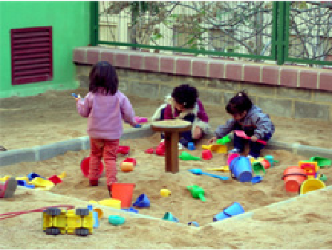 | La sorra, com l’aigua, són dos materials bàsics per jugar. Cal planificar amb molta cura el racó de l’aigua, per tal de permetre als infants experimentar i poder fer-ho sense molestar, amb llibertat de moviments i respectant les normes d’us | ||