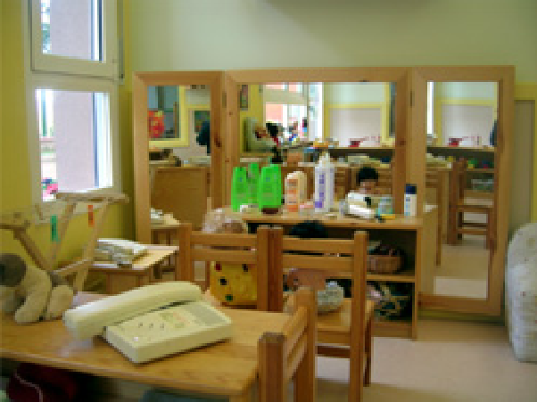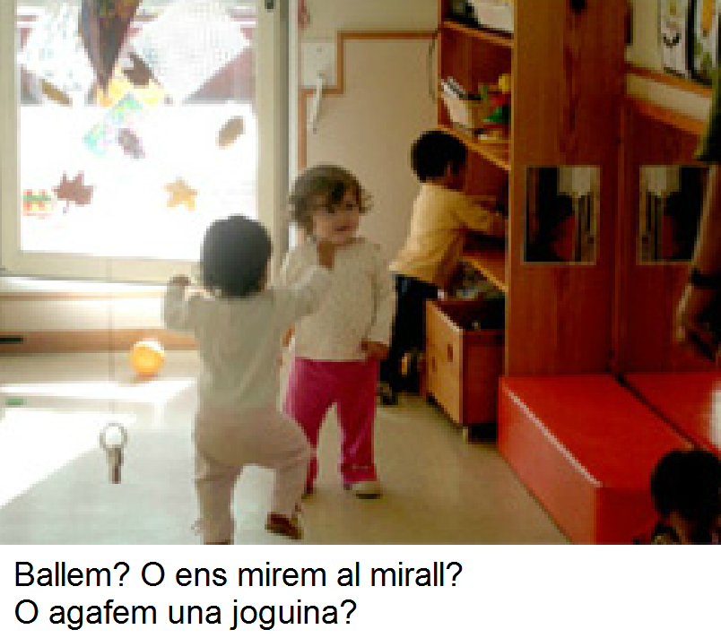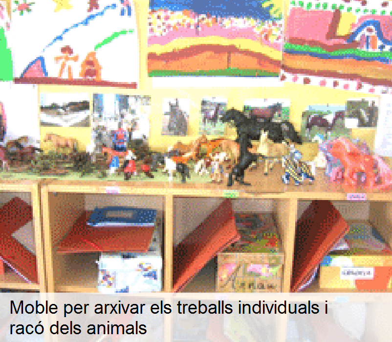 | Potenciació de la capacitat de representació, joc simbòlic i llenguatge | Fotografies, contes, làmines, nines, disfresses, cavallets de pintura, cuineta, mirall… |