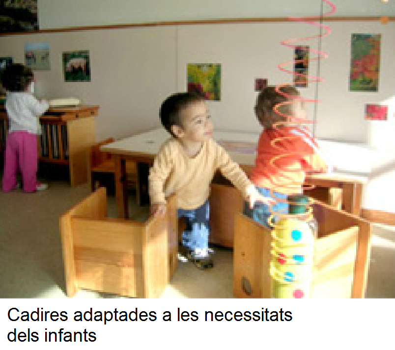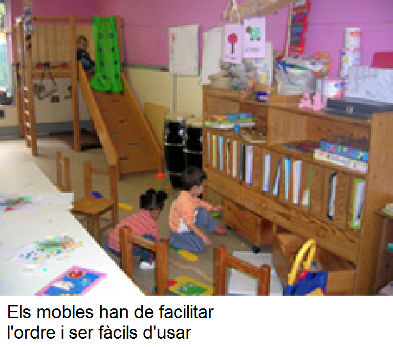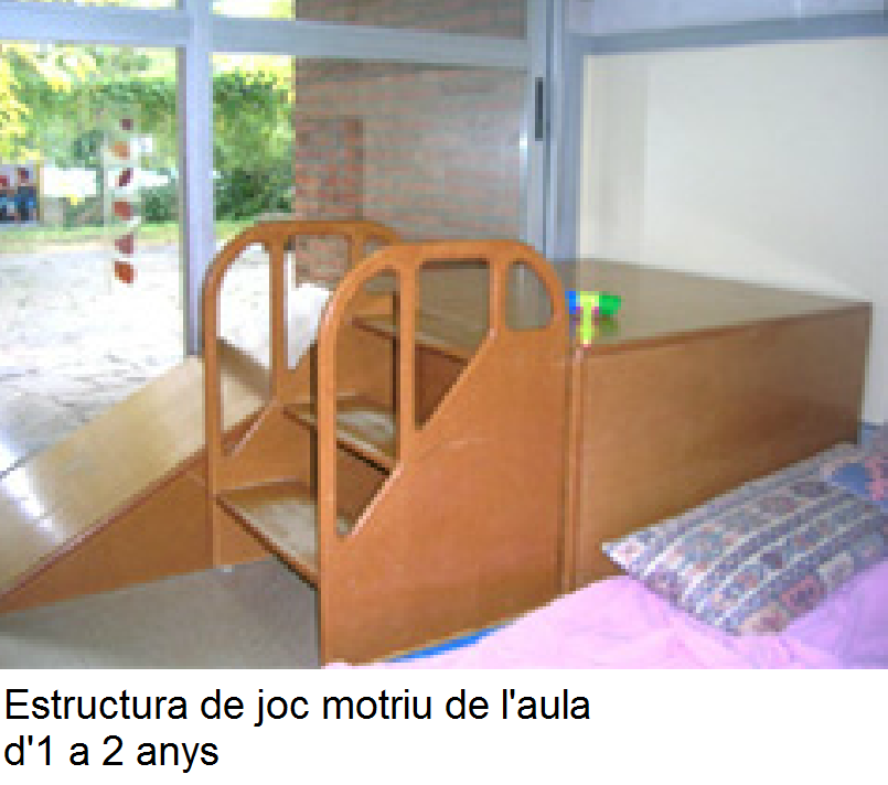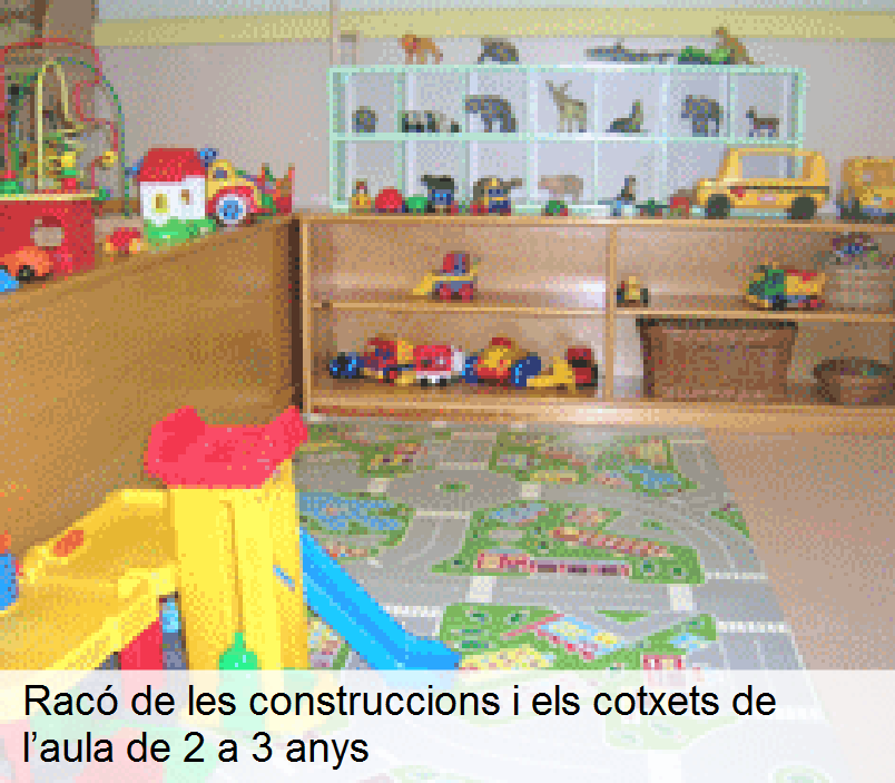 | Potenciació de les capacitats motrius | Arrossegadors, tricicles, torres, encaixos, materials per al joc heurístic i inespecífics (per a infants de 2 a 3 anys): rajoles petites, pinces per classificar, agrupar… |