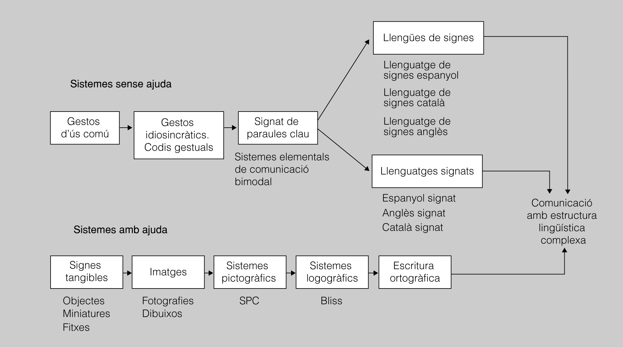 Hi ha una àmplia varietat de sistemes sense ajuda tècnica que en alguns casos són considerats i utilitzats com a augmentatius i en uns altres casos, com a alternatius. Alguns d’aquests sistemes són simples i comporten la utilització intencionada dels signes que habitualment s’utilitzen en tots els sistemes. D’altres són elaborats i tenen una estructura i funcionament propis.