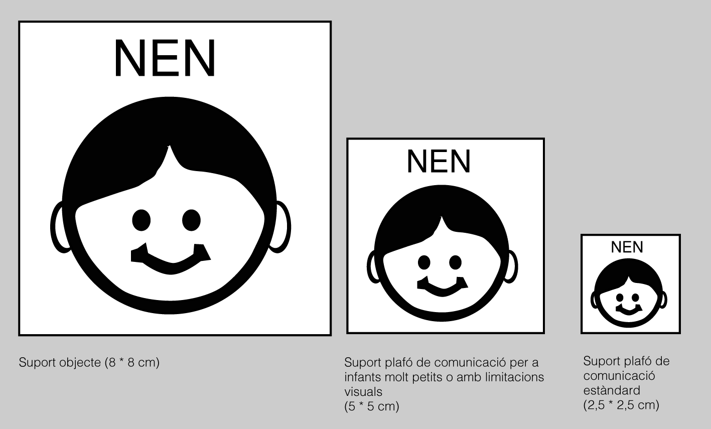 Els símbols es poden presentar en tres mides de vuit per vuit centímetres, cinc per cinc centímetres o dos i mig per dos i mig centímetres, en funció del suport que s’utilitzi (vegeu-ne un exemple en la figura).