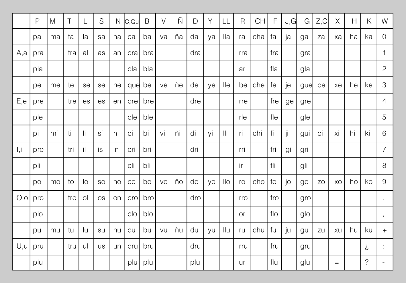 El sistema pot estar format per l’alfabet de la llengua organitzat per lletres, o per les síl·labes de la llengua, o per les paraules o frases habituals. A més se solen incloure els signes de puntuació i els nombres.